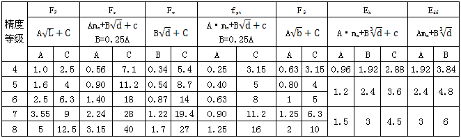 ①切向綜合公差Fi′、一齒切向綜合公差Fi′、螺旋線波度公差ffβ、軸向齒距極限偏差±FPK、一個軸向齒距偏差fpx、中心距極限偏差fa分别按下列計算式計算: