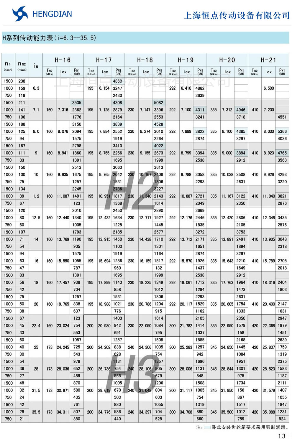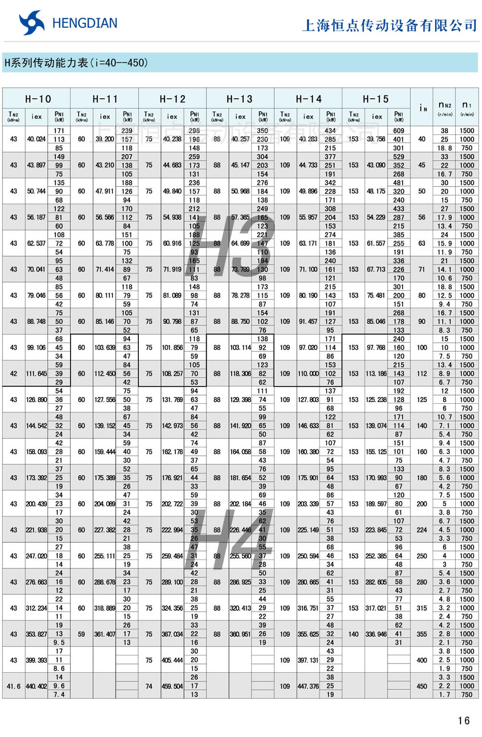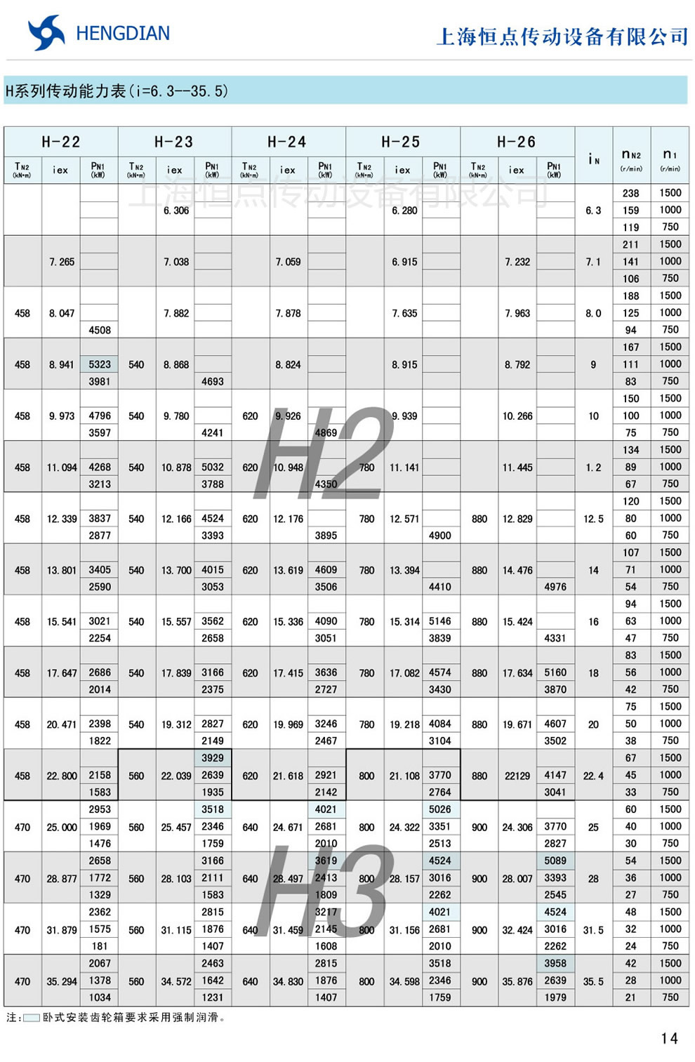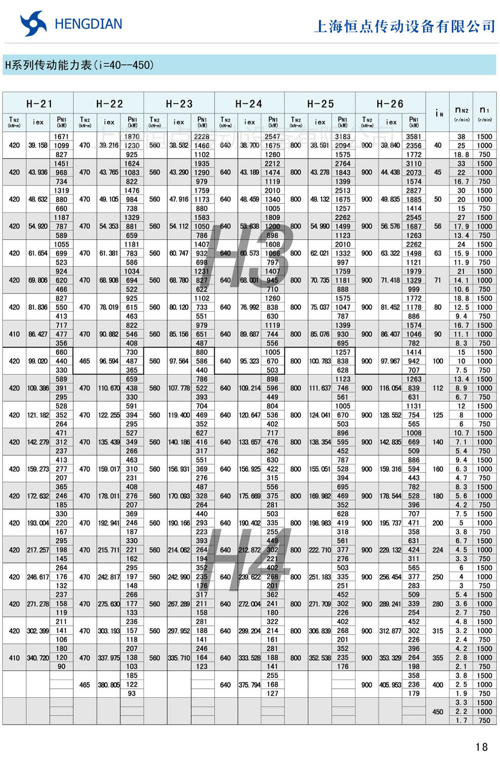 H系列傳動能力表 - HB标準工業齒輪箱